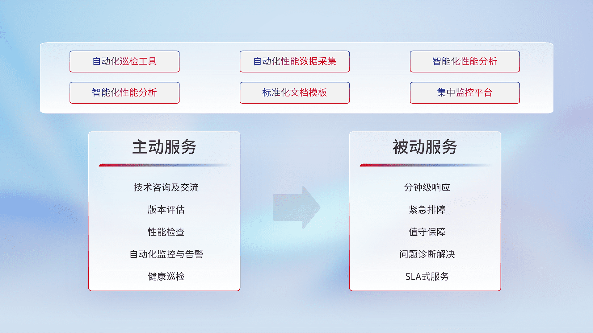 智能化工具和标准化文档,,保障服务质量,,,,提供主动服务(包含技术咨询、、、、版本评估、、、、性能检查、、、自动化监控与告警、、、、健康巡检)和被动服务包含(分钟级响应、、、紧急排障、、、值守保障、、、、问题诊断解决、、SLA服务)。。。